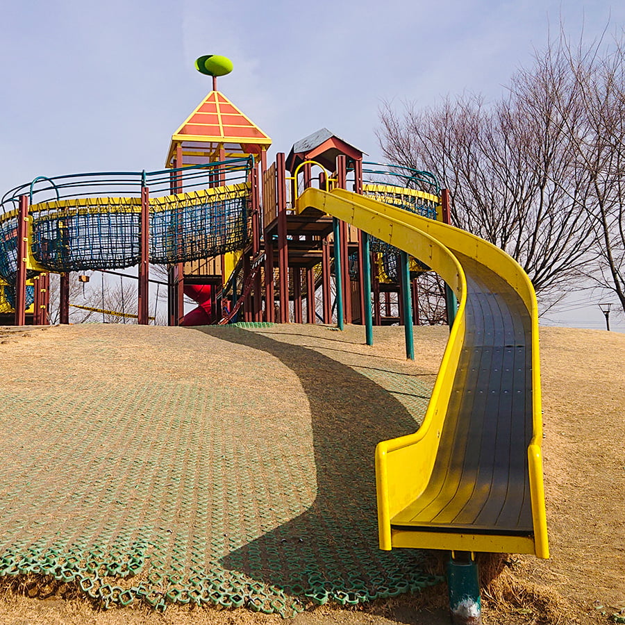 幼児・児童用遊具が設置されています。すべり台やネット遊具、ターザンロープなどがあります。その下には芝生が広がっていて、さまざまな遊びにご利用いただけます。小さなお子様は保護者と一緒に遊んでください。約束を守り、なかよく遊びましょう。